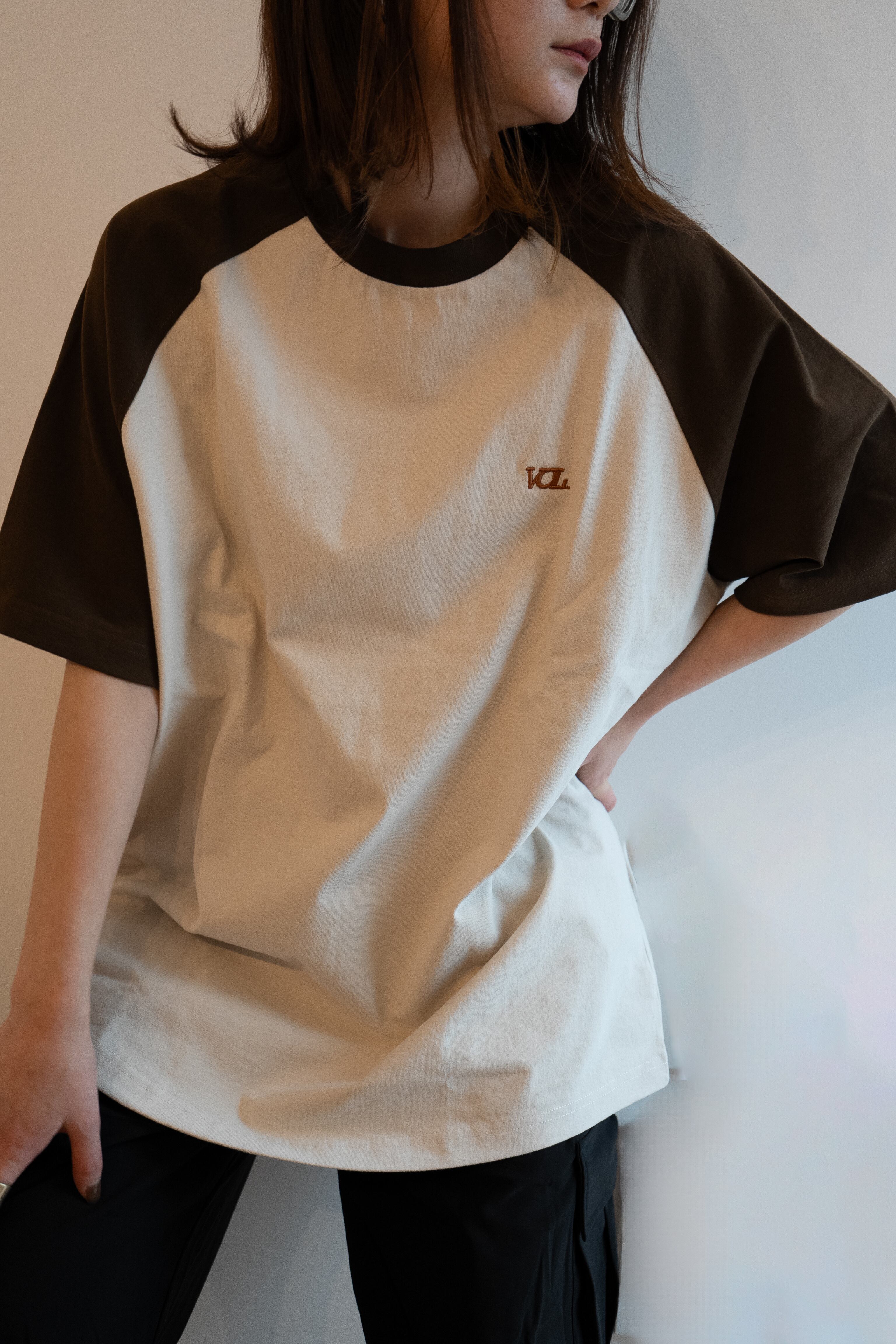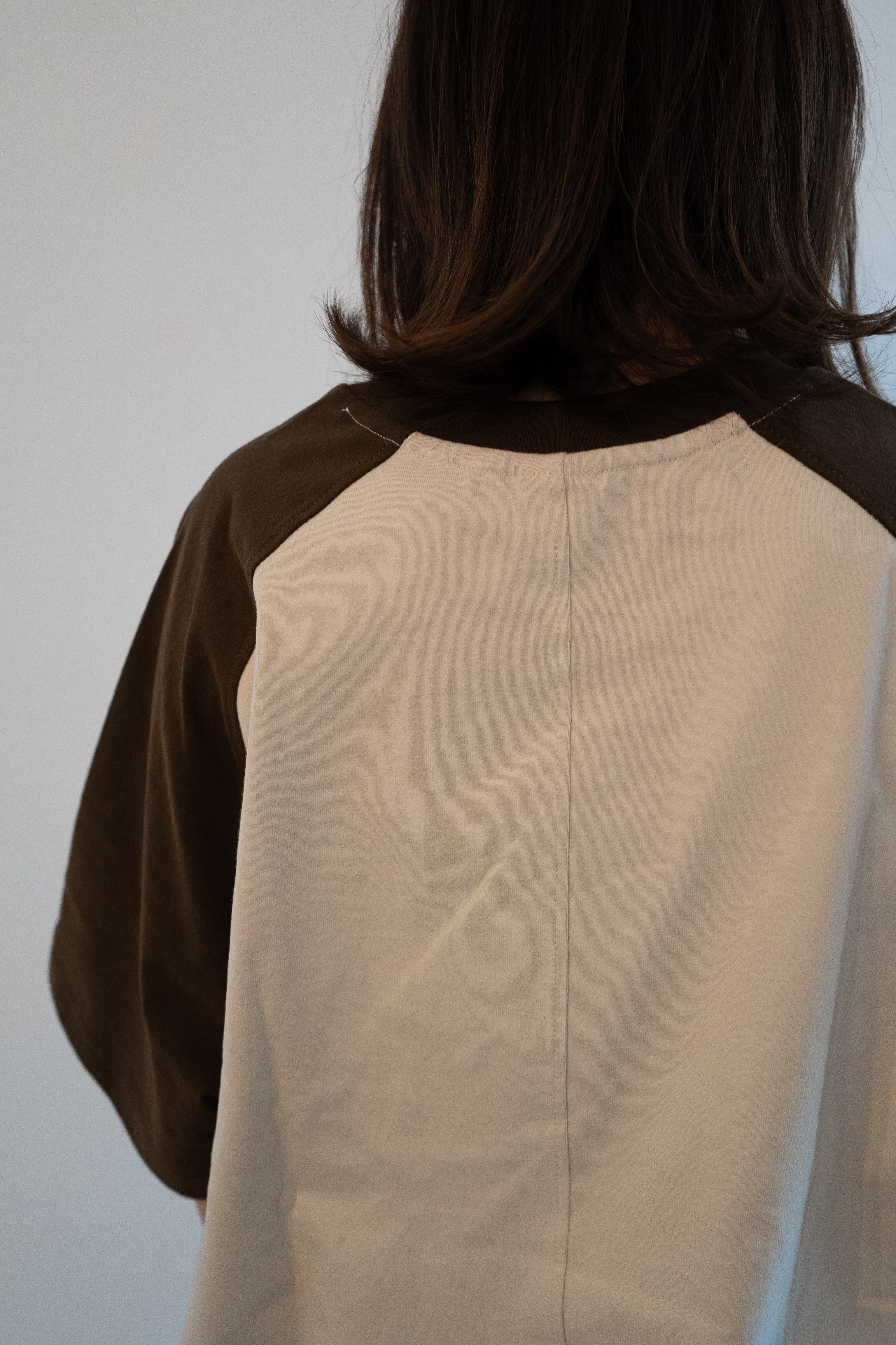 ラグランスリーブTシャツをバイカラーで仕上げました。 他にない絶妙なブラウンで他と差をつけます、 程よい厚みのある素材は肌触りも◎ オーバーサイズなのでメンズも着用できます。 サイズ詳細をご参照下さいませ。 【サイズ】FREE 着丈 75cm 身幅 64cm 裾幅 63cm 【素材】 綿100%